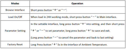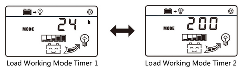 Under the load mode setting interface, long press button “+”, when Timer 1 or Timer 2 begin flashing, short press button “+” or “-” to set parameter, then long press button “+” to save and exit.